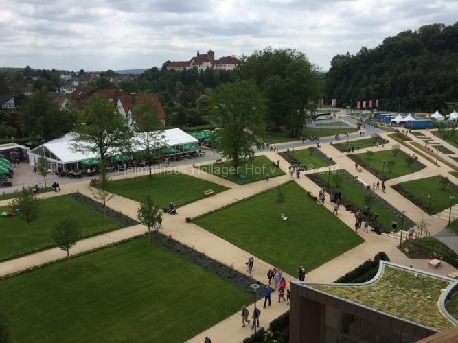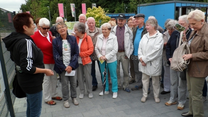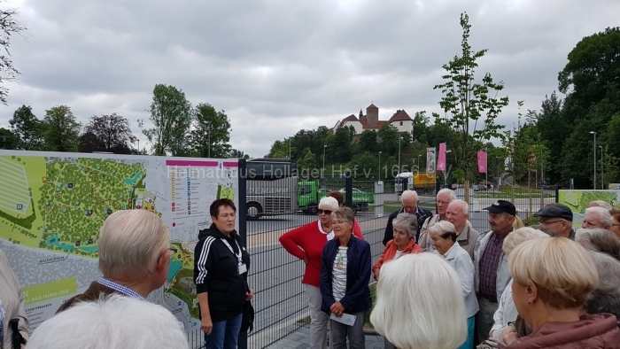 Mit Eintrittskarte bewaffnet und an den Händen gestempelt treffen wir dann auf unseren Guide, der sich als Frau Schaiper vorstellt. Genau diese haben wir uns als Begleiterin gewünscht, weil wir aus sicherer Quelle wissen, das sie profunde Kenntnisse vorhält und kein Mikrofon braucht, um uns akustisch zu erreichen. Sie wird uns für gut 90 Minuten durch die Gartenschau führen.