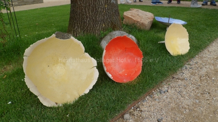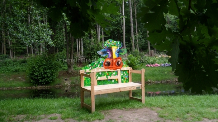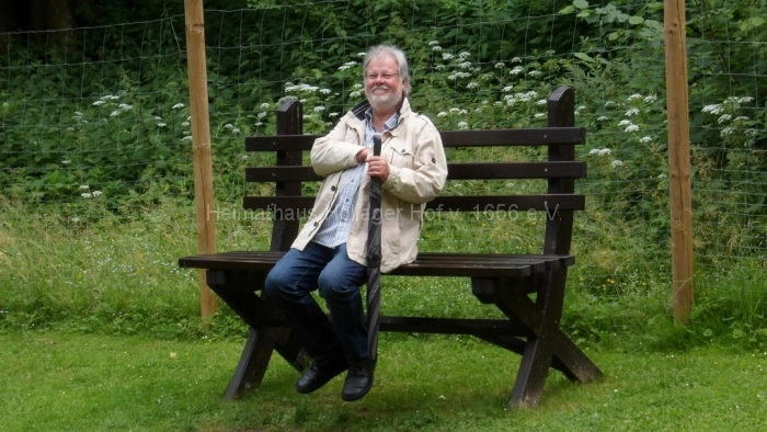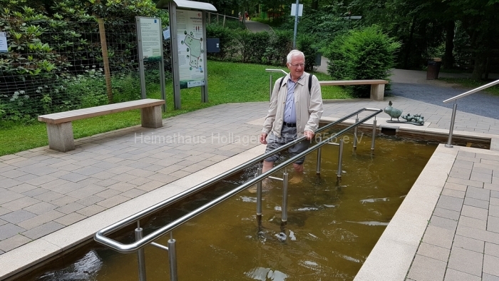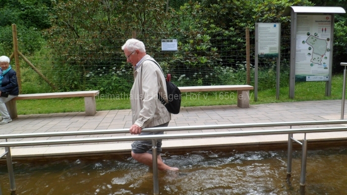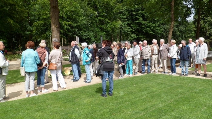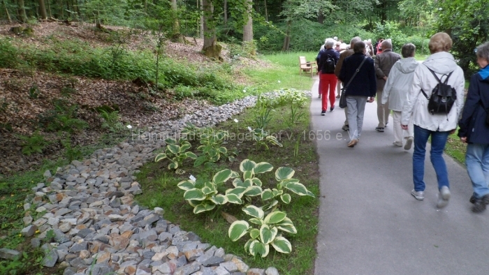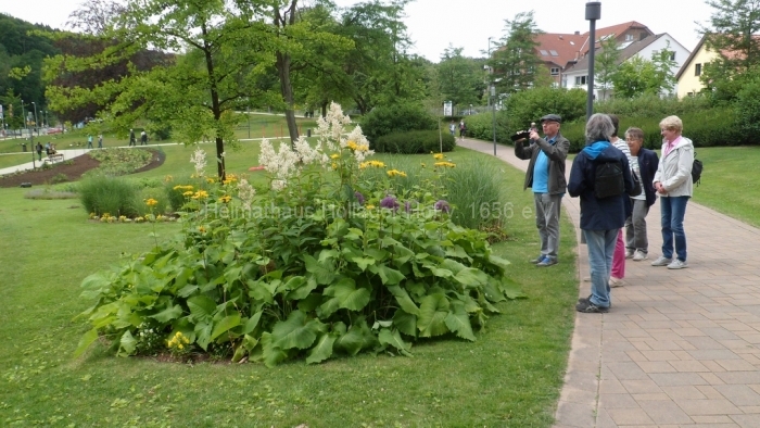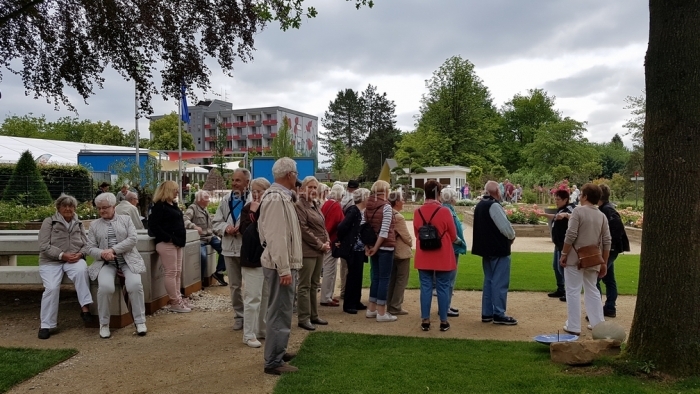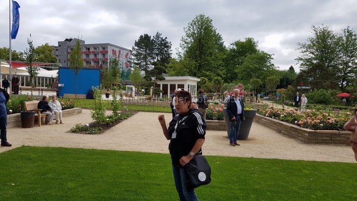 Wir bewundern die blühenden Anpflanzungen, benutzen die Wassertretstelle (Kneipp lässt grüßen), die bemalten Ruhebänke und wenden uns mit Frau Schaiper – nach kurzem Besuch der Andachtstelle – dem Rosengarten zu.