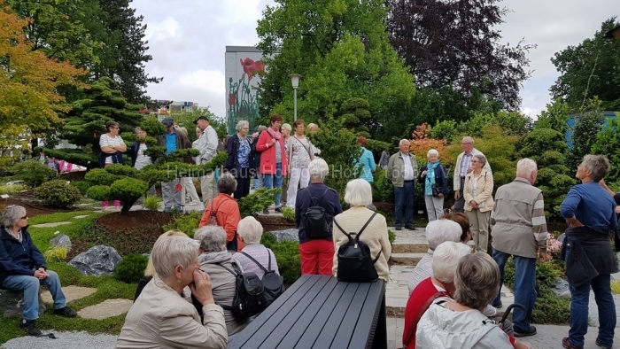 Unsere Frau Schaiper weiß zu allem etwas zu berichten und verpackt das so interessant, dass uns zu keinem Zeitpunkt langweilig wird. Nach dem Europaplatz mit dem Blumenhaus „bereisen“ wir im Schnellgang die Klimazonen unseres Planeten von Nord nach Süd, durch die dort aufgebauten 12 Themengärten. Lappland, das Land der Samen, mediterrane Gärten, aber auch über 100 Jahre alte Bäume aus Japan können wir bestaunen und die Geschichten dazu hören.