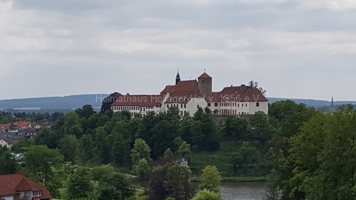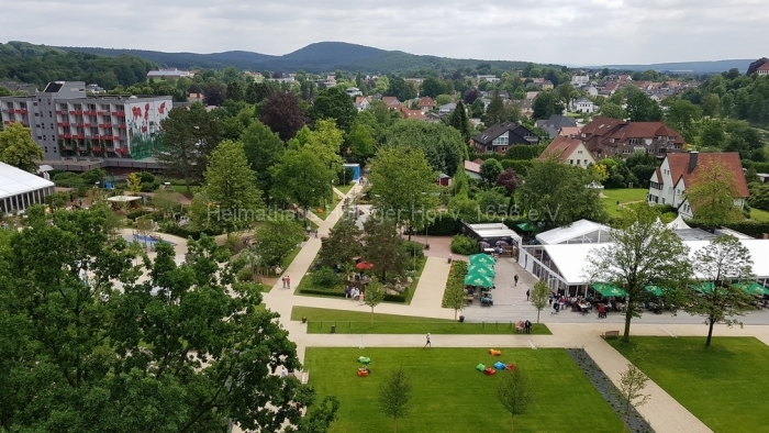 Zum Glück gibt es einen Lift, mit dem man auch ohne Schnappatmung nach oben gelangt. Dort bietet sich eine grandiose Aussicht auf die Ausstellung, den Charlottensee, das Schloss und den Wald. Dass es um Bad Iburg so viel Wald gibt, ist wohl nicht allen so bewusst gewesen.