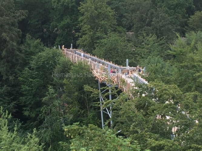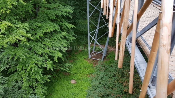 Auf dem 4,2 Mio. teuren Baumwipfel-Pfad bewegt man sich zwischen den verschiedensten Baumsorten sehr sicher ca. 400 m in den Walt hinein. Da der Berg hier ansteigt, ist der Abstieg dann nicht mehr so spektakulär. Folglich gibt es am Ende des Pfades auch keinen Lift. Runter ist eben immer einfacher.