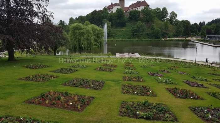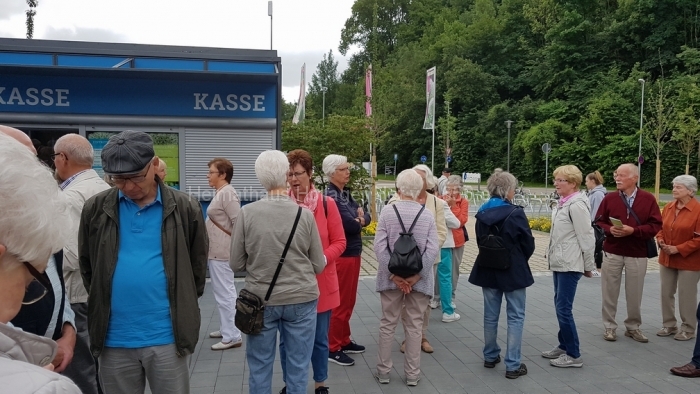 Aber fangen wir besser doch ganz von vorne an, morgens an der Weltkugel in Hollage. Fünfundvierzig Teilnehmer/innen besetzen um 09:00 Uhr den Hörnschemeyerschen Bus und ab geht es quer durch Osnabrück zur Landesgartenschau nach Bad Iburg. Trotz zähflüssigem Verkehrsaufkommen in der Stadt sind wir sehr pünktlich und warten auf die Öffnung der Kassen um 10:00 Uhr. Kaum zu glauben, wie viele nicht mehr Berufstätige hier schon am Dienstagmorgen unterwegs sind und wie viele Schulkinder, die klassenweise antreten und den Altersdurchschnitt drastisch senken.