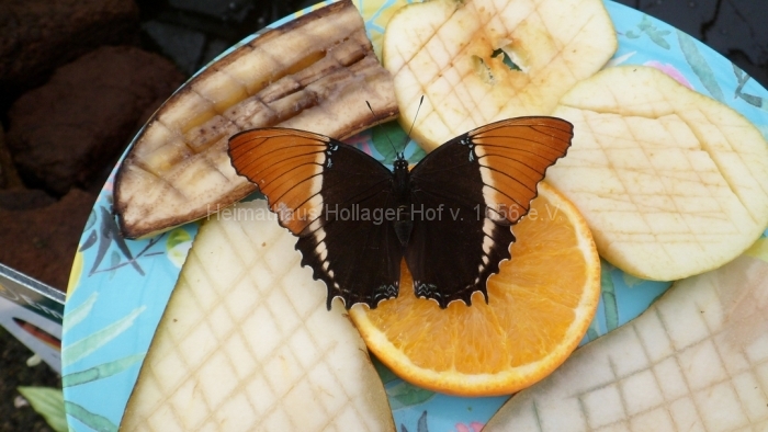 Nach der stärkenden Mahlzeit geht es über die Brücke, am Charlottensee vorbei, der mit vielen bunten Blumenbeeten umsäumt ist. Das Schmetterlings-Haus ist unser Ziel. Große blaue Falter flattern in schwül-warmer, feuchter Luft zwischen den Besuchern umher, die krampfhaft und erfolglos versuchen, diese Zickzack-Flieger mit der Kamera zu erlegen. Der Regenwald ist aber nicht jedermanns Sache.
