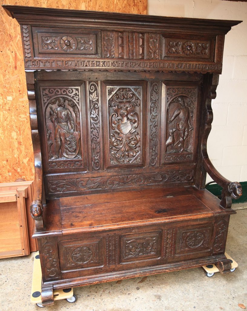 Und es gibt noch einen Hinweis, dass die Bank einem Eigentümer in unserer Region zuzuordnen ist. Auf der Rückwand der Bank befindet sich ein Aufkleber, aus dem hervorgeht, dass die Bank per Eisenbahn von Bohmte versandt wurde. Möglicherweise hat das historische Möbelstück Ende des 19. Jahrhunderts oder zu Beginn des 20. Jahrhunderts per Eisenbahn den Weg nach Hamburg gefunden. In Bohmte und den umliegenden Orten ist den besonders Ortskundigen eine Familie, die den Namen „Köster zu Hollage“ trug, nicht in Erinnerung.