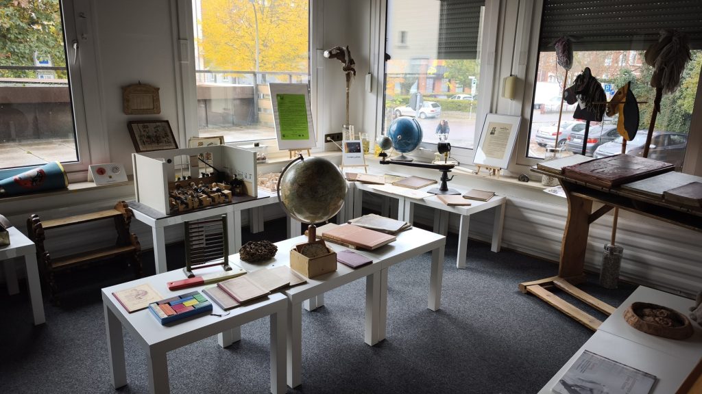 Im Programmflyer des Heimatvereins Hollager Hof war dieser Besuch als Busfahrt in die Osnabrücker City seit der Jahresmitte angekündigt. Da wir uns heute mit 10 angemeldeten Interessenten eher in einer Kleingruppe wiederfinden, macht ein Bus keinen Sinn. Wir fahren mit zwei PKW zum Arndtplatz, wo das Osnabrücker Schulmuseum sein neues Zuhause gefunden hat. Ursprünglich war der Trägerverein, gegründet 1997, mit dem Schulmuseum an der Rolandsmauer beheimatet. Dort musste das Museum dem Bauvorhaben der Friedensschule weichen.