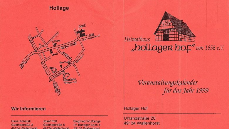 Veranstaltungen 2000 16. März 10. JahreshauptversammlungBeginn: 19.30 UhrDiavortrag: Prof. H. Kohstall-10 Jahre Verein Heimathaus Hollager Hof- 22. März Vortrag zur Geschichte HollagesSiedlungs- u. Sozialgeschichte bis etwa 1800Referent: Dr. DelbancoBeginn: 19.30 UhrEintritt: 6,00 DM(In Zusammenarbeit mit dem KVH Hollage) 31. März weiterlesen …
