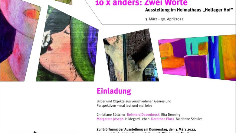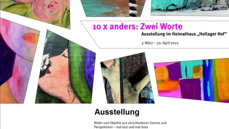 Die zehnköpfige Neuenkirchener Künstlergruppe „10x ANDERS“ präsentiert ihre Werke auf der Diele des Heimathauses „Hollager Hof“. Als Thema haben die Kunstschaffenden den Begriff „zwei Worte“ gewählt, Bilder und Objekte aus verschiedenen Perspektiven und Genres – mal laut und mal leise.