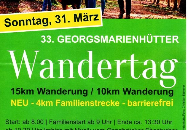 Am 31. März wird die Gruppe der Sonntagswanderer des Heimatvereins „Hollager Hof“ am Georgsmarienhütter Wandertag in Oesede teilnehmen. Vorgesehen sind 15 km und 10 km Wanderstrecken und neuerdings auch eine familienfreundliche und barrierefreie 4 km-Strecke. Angekündigt ist auch ein Imbiss weiterlesen …